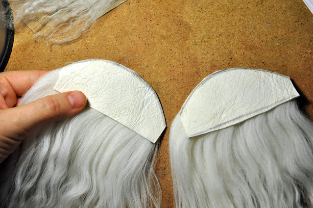 We're almost done. Now you will get that piece of mohair you folded/glued in the beginning. Hold the hair back (you can secure it with a rubber band if you prefer) so it won't stick to the glue. Place the skin on top of the scalp so that the portion of both flat surfaces are in contact. They are to be glued together.